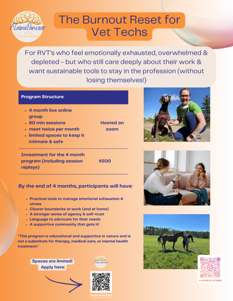 The Burnout Reset for Vet Techs, designed by Alaina Panesar, is specifically for RVTs who are experiencing burnout, emotional exhaustion, and overwhelm—but who still care deeply about their work and want sustainable tools to remain in the profession.