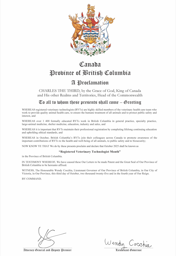 Vancouver, BC — The BC Veterinary Technologists Association (BCVTA) is proud to announce that the Province of British Columbia has once again issued an official proclamation recognizing